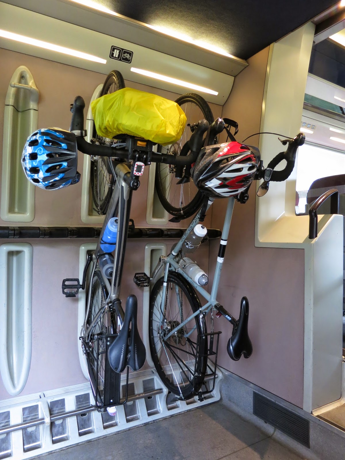 In some ways we had an easier time on UK trains. A surprise to us given the bike friendly culture that exists in France by comparison. But it is improving in the UK, thanks to Sir. Wiggo, Froomey, the Tour de France and the Olympics. In fact we quite liked the bike racks on the trains there…..simple to roll the front or back wheel into their designated spot, and in our experience no hefting of the bike halfway up the carriage wall…..Oh, and their elevators are often big enough to accommodate bikes, a rare commodity in France – there were a lot of stairs to tackle I gotta say.