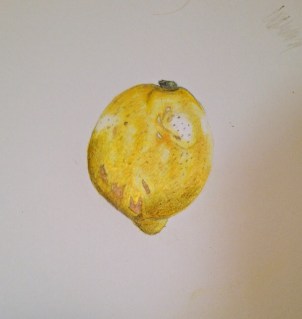 I think I drew a lemon. What I mean is, it’s a ‘lemon’ in the flawed sense of the word. This is the first drawing from life, as opposed to copying from another illustration. Having to guess the colours used (not all yellows are created equal!) and then take the plunge. The citron I used has a very smooth rind, not like, for instance Amalfi lemons. So perhaps next time……meanwhile I have some learning to do, and practice.